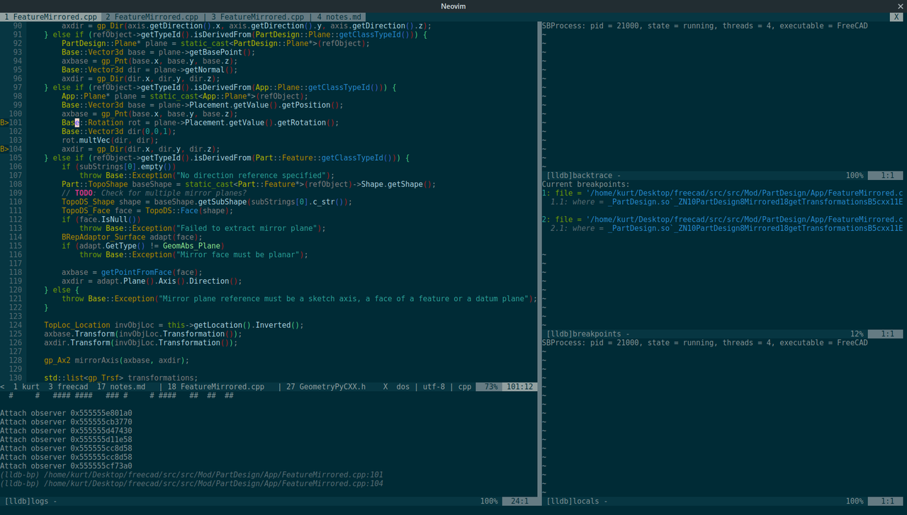 C++ is a very different beast. In this case, stepping through the code with a debugger was my only choice. I use Neovim as my IDE, though, so I wanted a way to combine the power of my text editor with my debugger. So, I found and set up LLDB.nvim, an LLDB frontend, with an event-based, non-blocking UI, session-saving, and "... takes advantage of Neovim's job API to spawn a separate process and communicates with the Neovim process using RPC calls."
